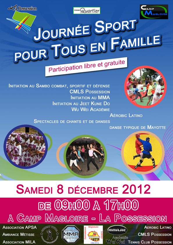 Venez en famille pour participer aux activités sportives et culturelles proposées lors de cette manifestation Tout au long de la journée, des initiations et des spectacles vous seront proposés. Il y en aura pour tous les goûts et pour toute la famille, n’hésitez pas à en parler autour de vous et d’inviter tout le monde. Parents, enfants, grands-parents… Cette fête est faite pour vous, pour terminer l’année en forme et peut-être trouver une activité qui vous conviendra, qui sait ? Des stands seront à votre disposition pour vous restaurer tout au long de la journée. Des plats créoles et mahorais vous seront proposées avec les associations Ambians Métiss et Mila. L’association APSA sera également présente pour nous informer des activités proposées aux personnes handicapées. Concernant nos activités arts-martiaux et sports de combat, le club CMLS Possession et la Wu Wei Académie vous proposeront des initiations et perfectionnements en Sambo, MMA et Jeet Kune Do. Nous aurons le plaisir d’accueillir le Comité Régional de Mixed Martial Arts en la présence de son Conseiller Technique Fédéral, M. Cédric Certenais ainsi que la Commission Régionale de Sambo en la présence de son Conseiller Technique Fédéral, M. Jean-Do Payet et de son Président, M. Jean-Marc Visnelda. Le rendez-vous est pris, nous vous attendons nombreux et en forme !!